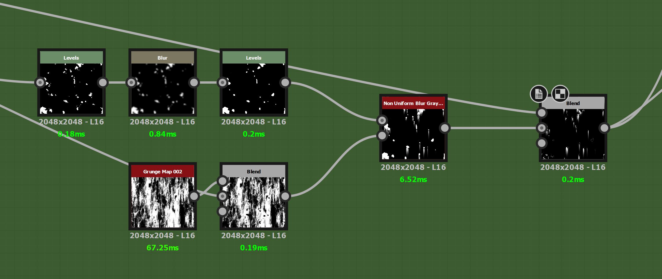 This is a smaller version of how the peeling was set up in the rusting painted steel, adding a lot of extra break up and variation here with extra slope blurs and blends is the way to go. The non-uniform blur has a lot of incredible applications, try it out if you haven’t already.